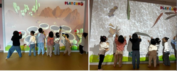 Infants and toddlers engaging in various virtual experiences using augmented reality (AR) programs in an AR classroom established by the Korea Workers' Welfare Service at a daycare center. (Photo courtesy of the Korea Workers' Welfare Service)Q. Could you elaborate on the smart childcare environment establishment program?